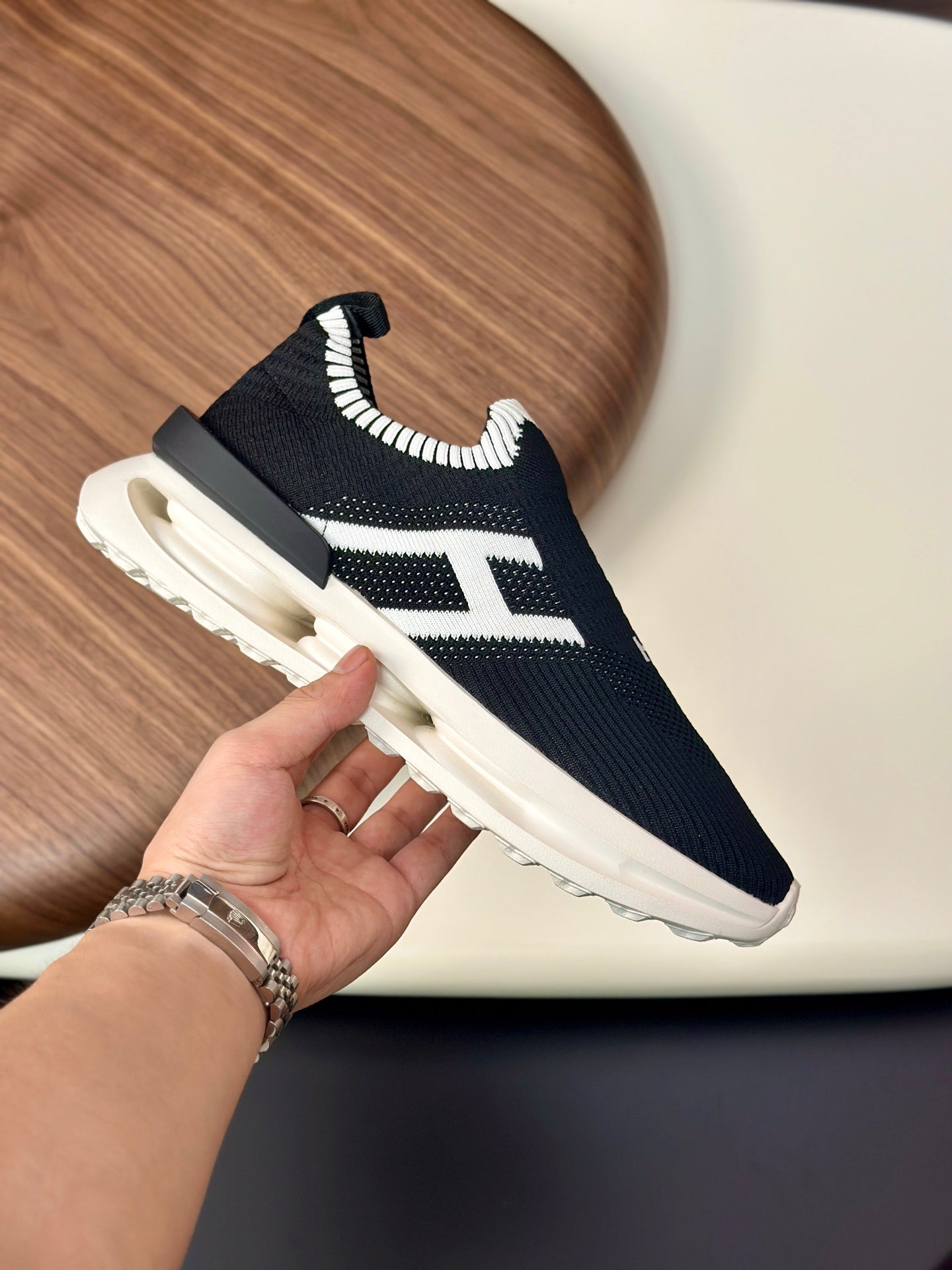 HM Men's Slip on Sneaker Black White Flyknit Fabric 690059