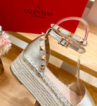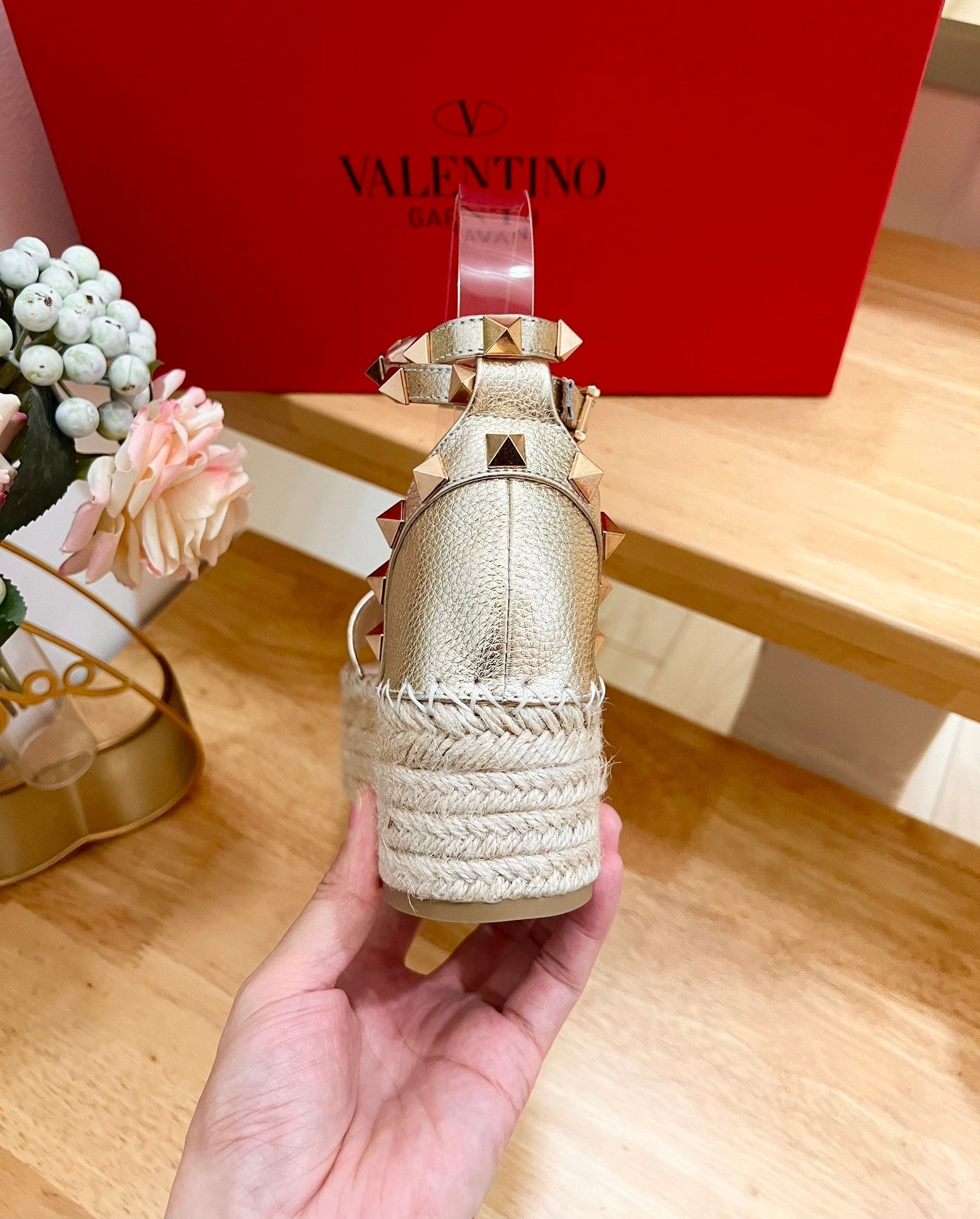 ROCKSTUD FLATFORM SANDAL IN LIGHT GOLD CALFSKIN