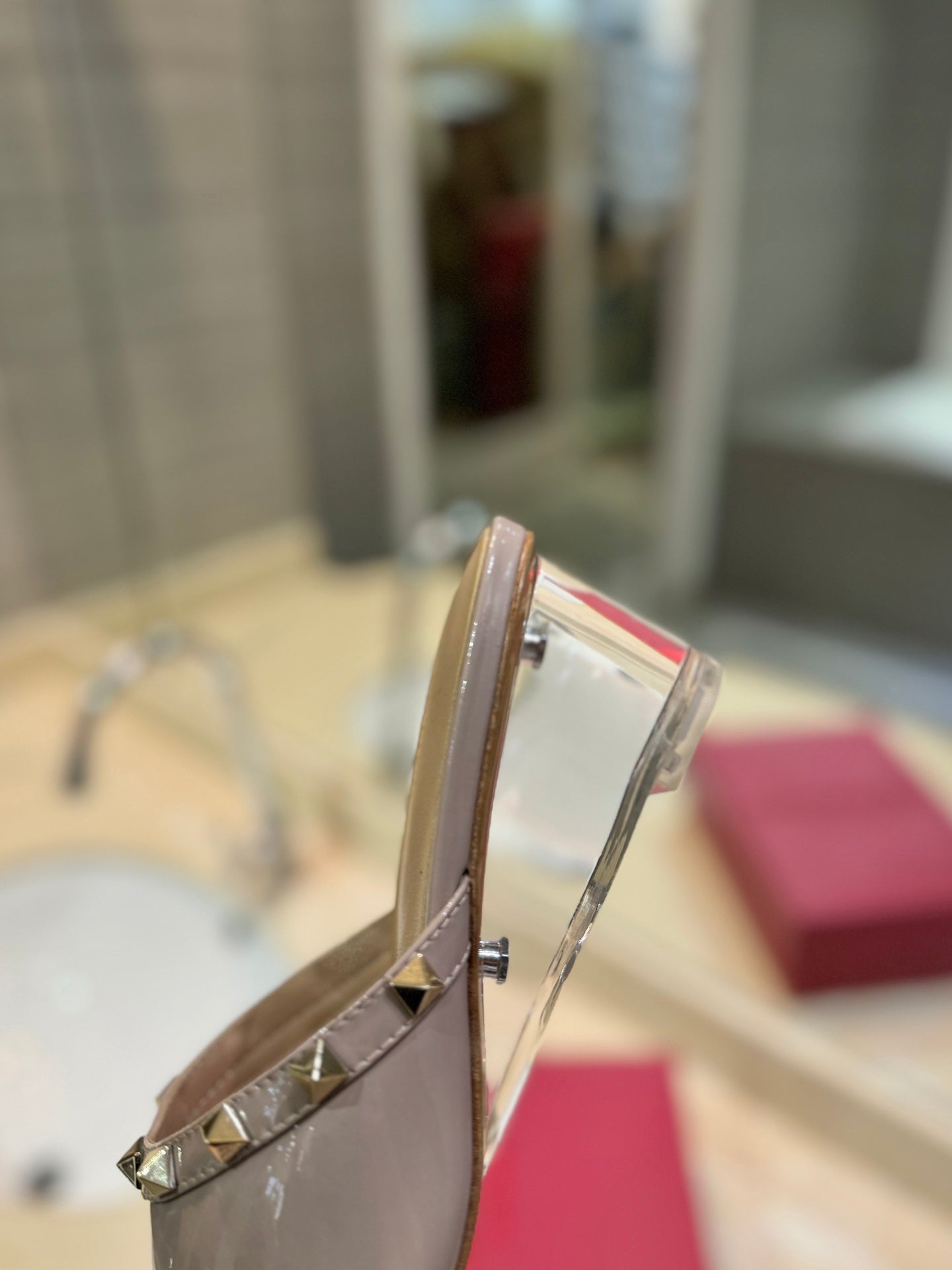 ROCKSTUD MULE SANDALS WITH TRANSPARENT HEEL IN CREPE PINK CALFSKIN