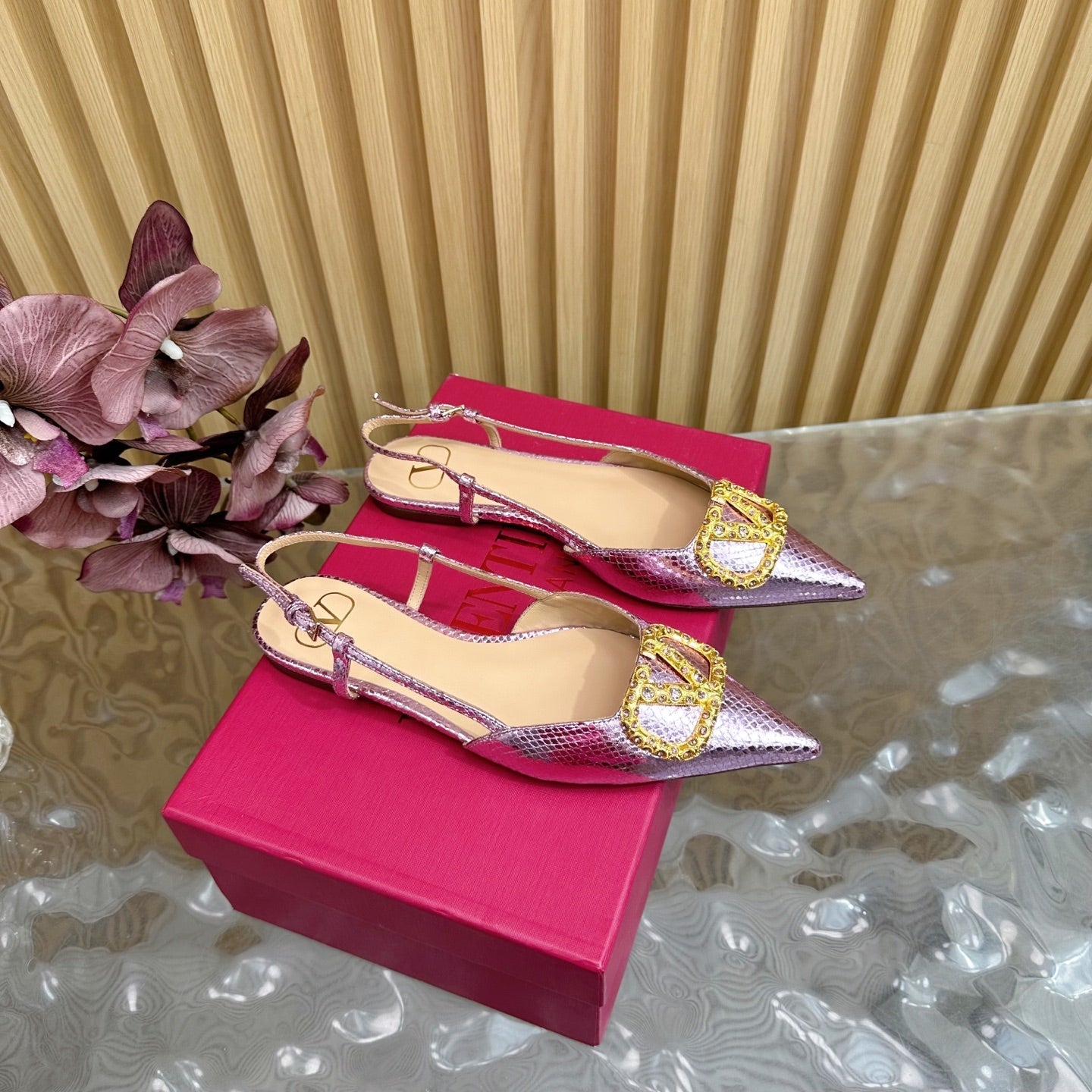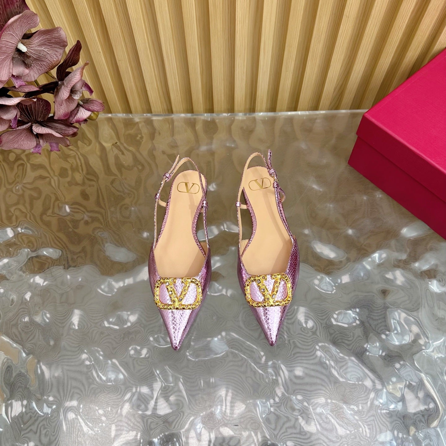 VT Slingback Flat Pink Snake-grain Leather 331936