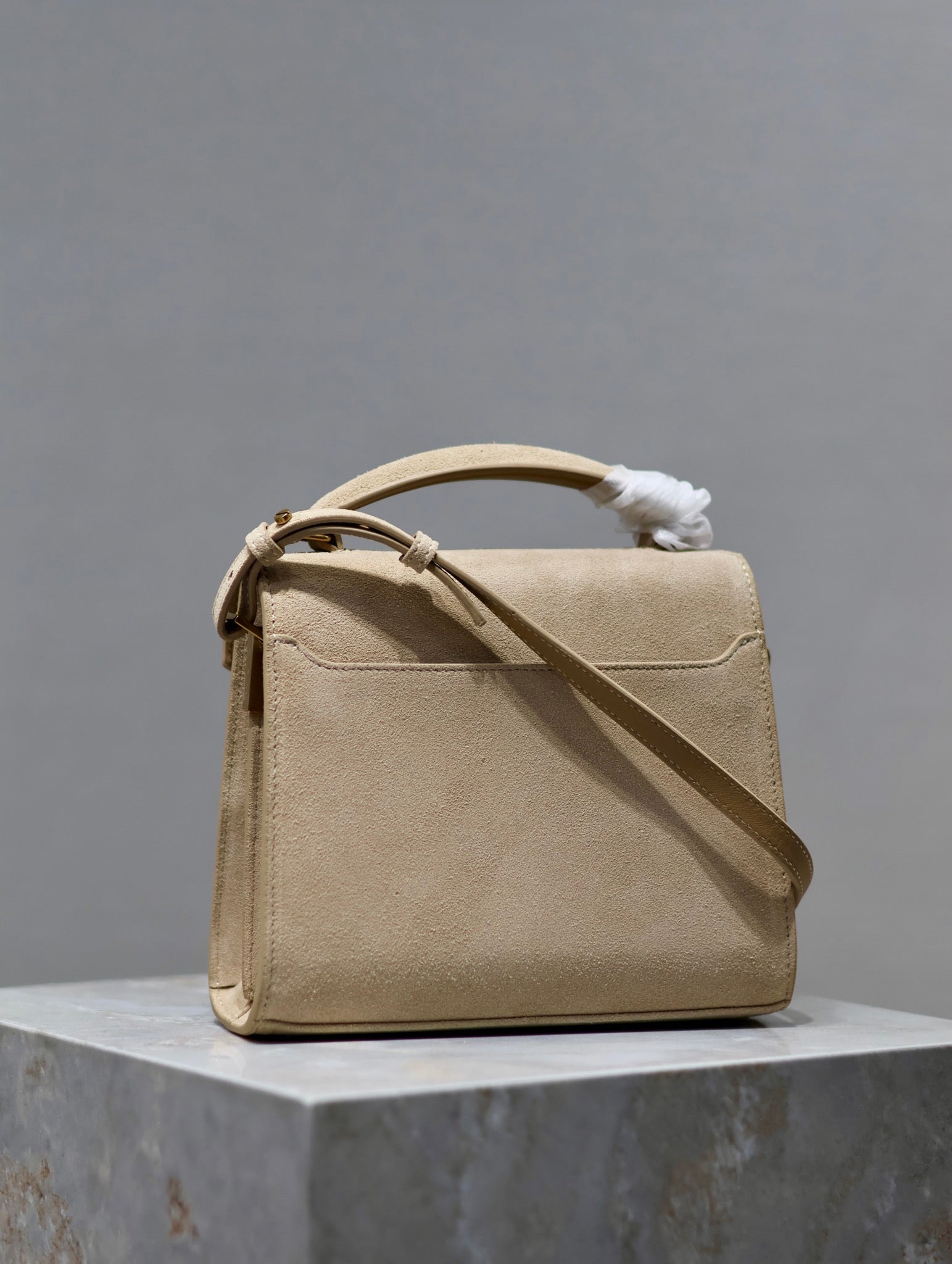 CASSANDRA MINI TOP HANDLE BAG 20 IN BEIGE SUEDE GOLD HARDWARE