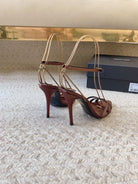 CROSS STRAP HIGH HEEL IN CHESTNUT SILK GOLD CHAIN