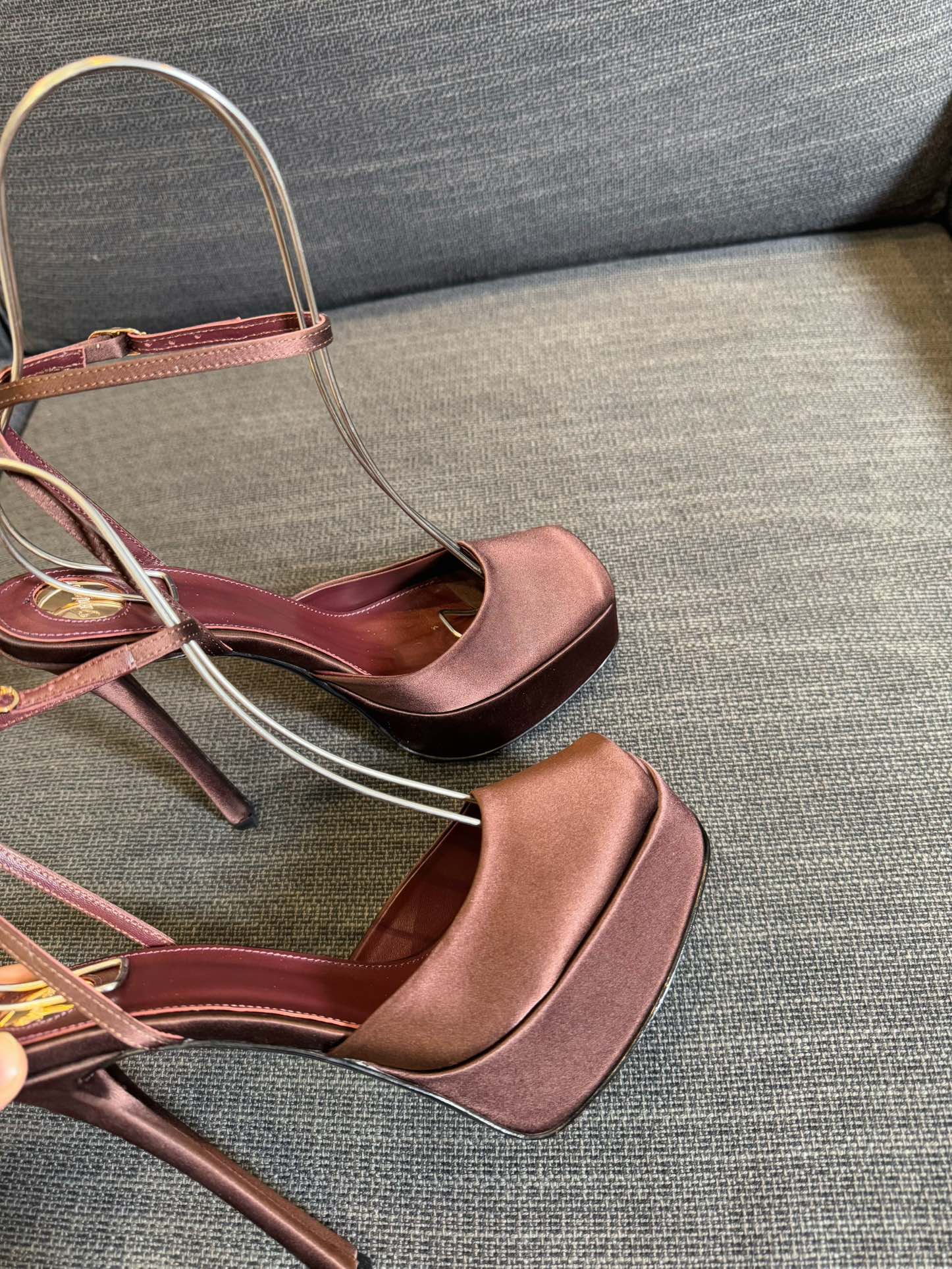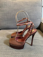 LA SCANDALE PLATFORM SANDALS IN DARK CAPPUCCINO SATIN