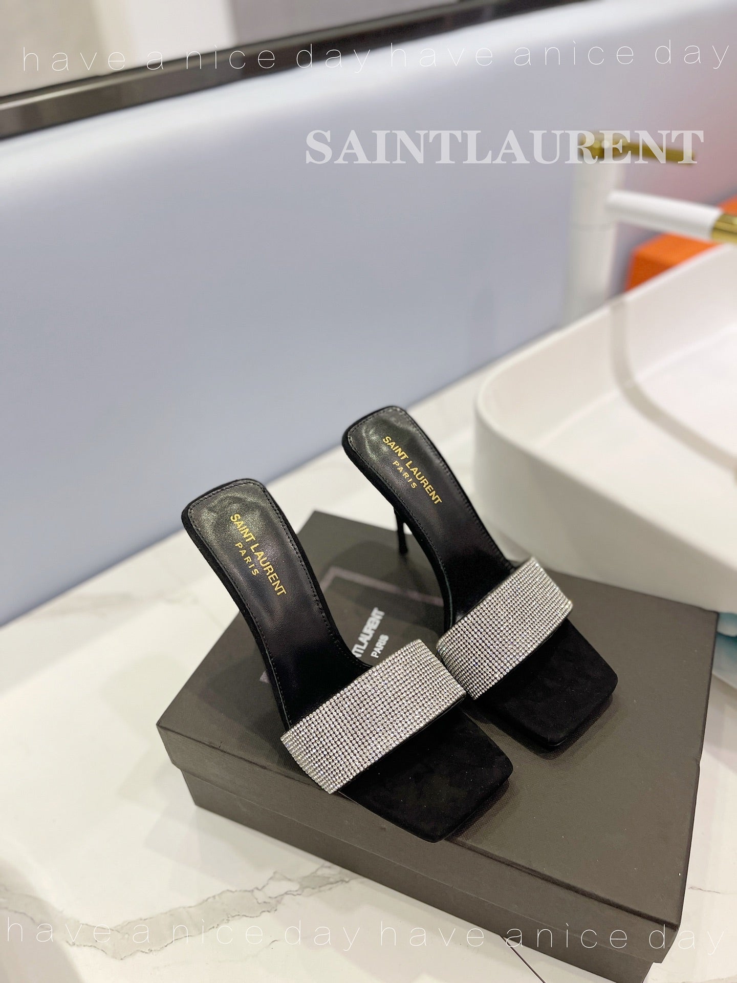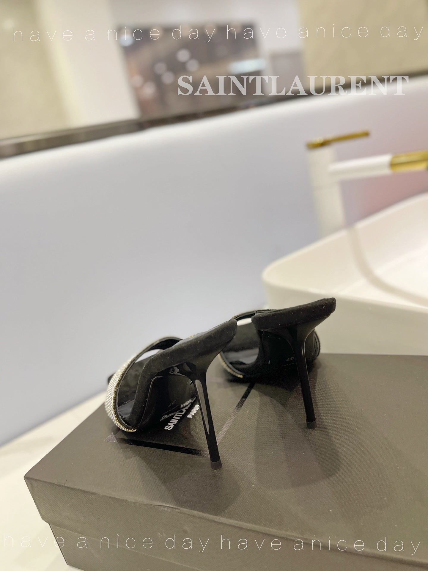 SL LUCKY WHITE CRYSTAL HIGH HEELS BLACK CALFSKIN