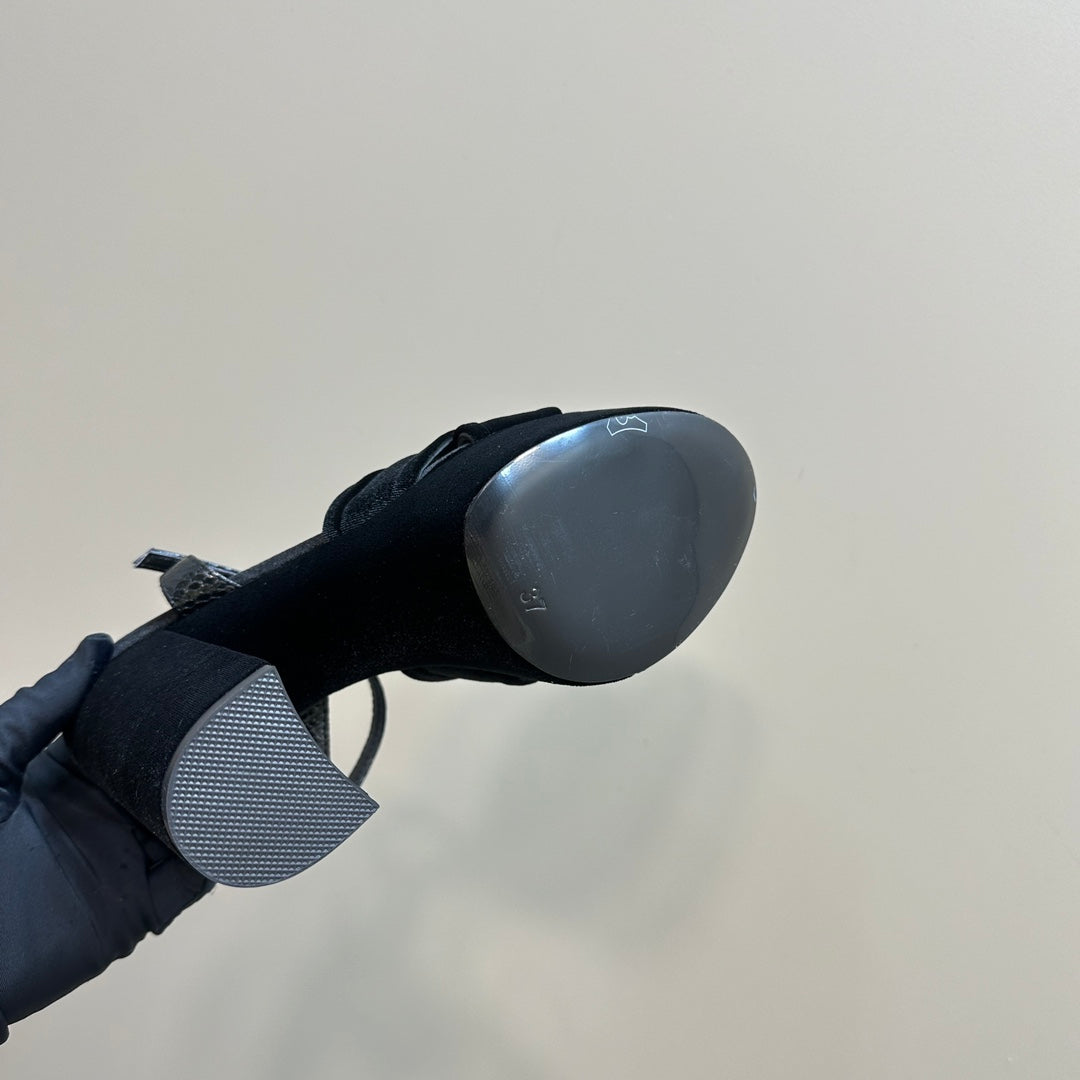 HIGH RHINESTONE CROSS STRAP MULES IN BLACK SILK