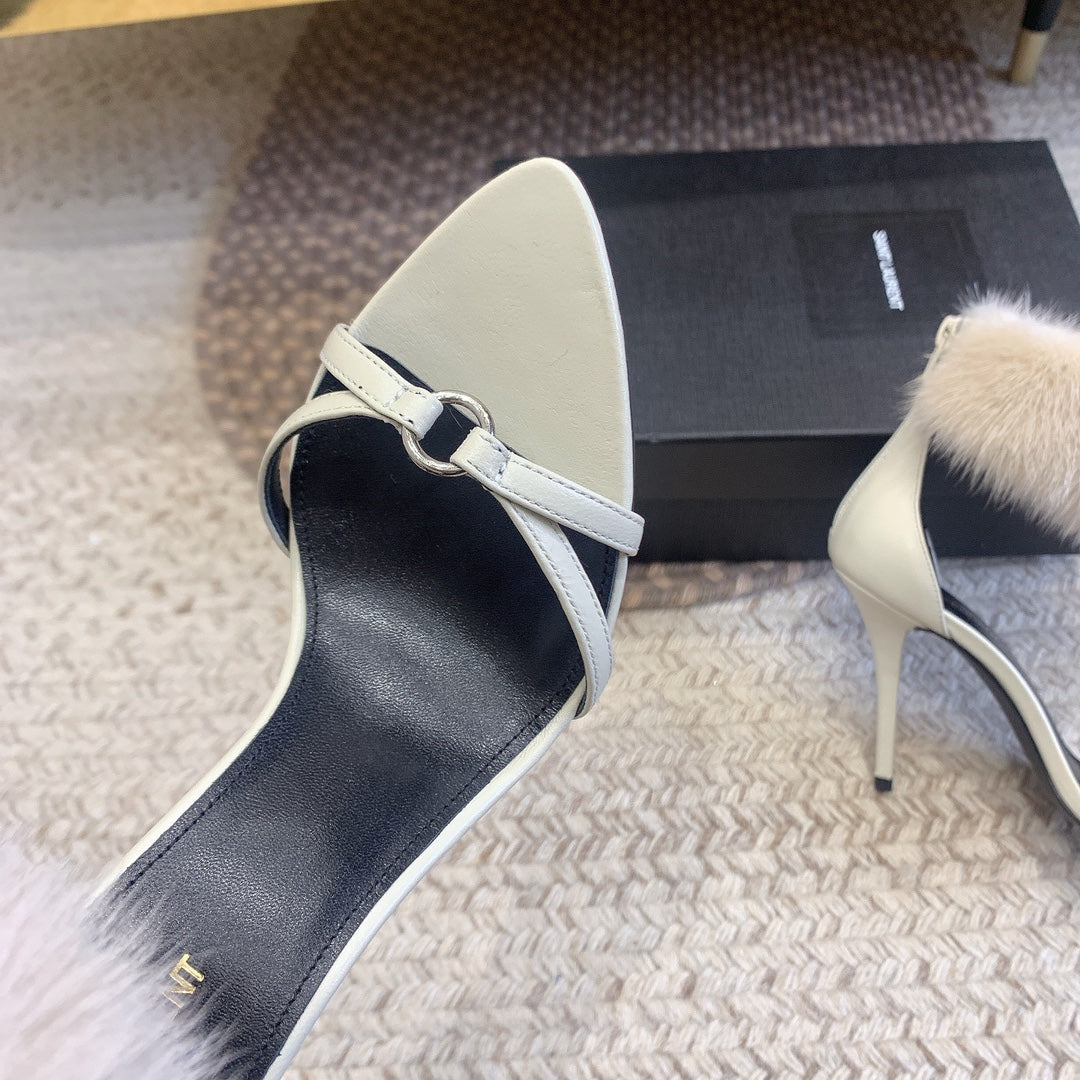 HIGH HEEL SANDAL IN WHITE POLISHED CALFSKIN AND MINK FUR