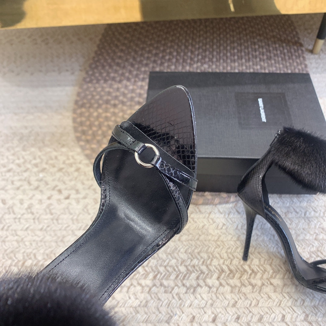 HIGH HEEL SANDAL IN BLACK POLISHED CALFSKIN AND MINK FUR