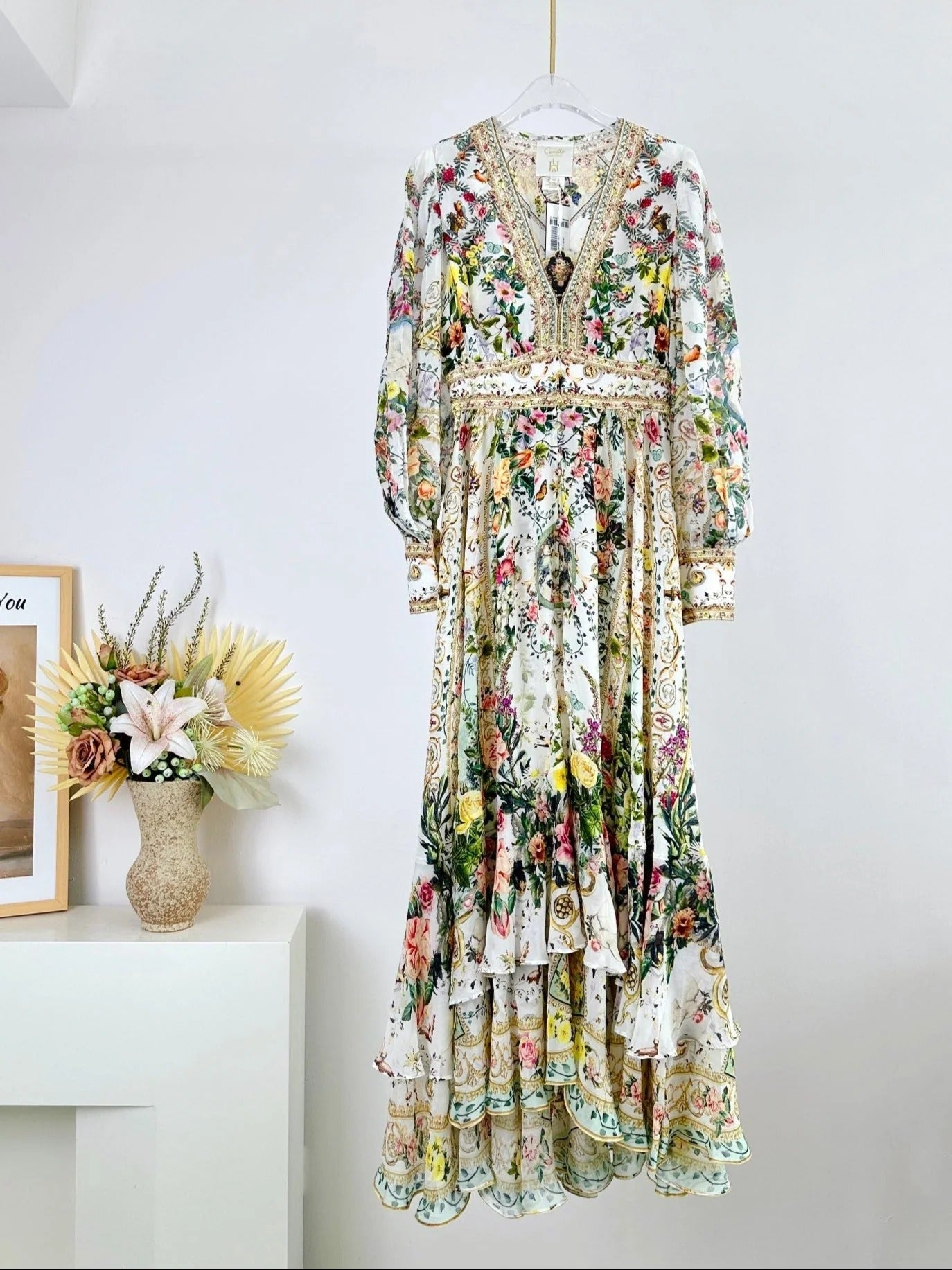V-NECK LAYERED SILK PRINT MAXI DRESS