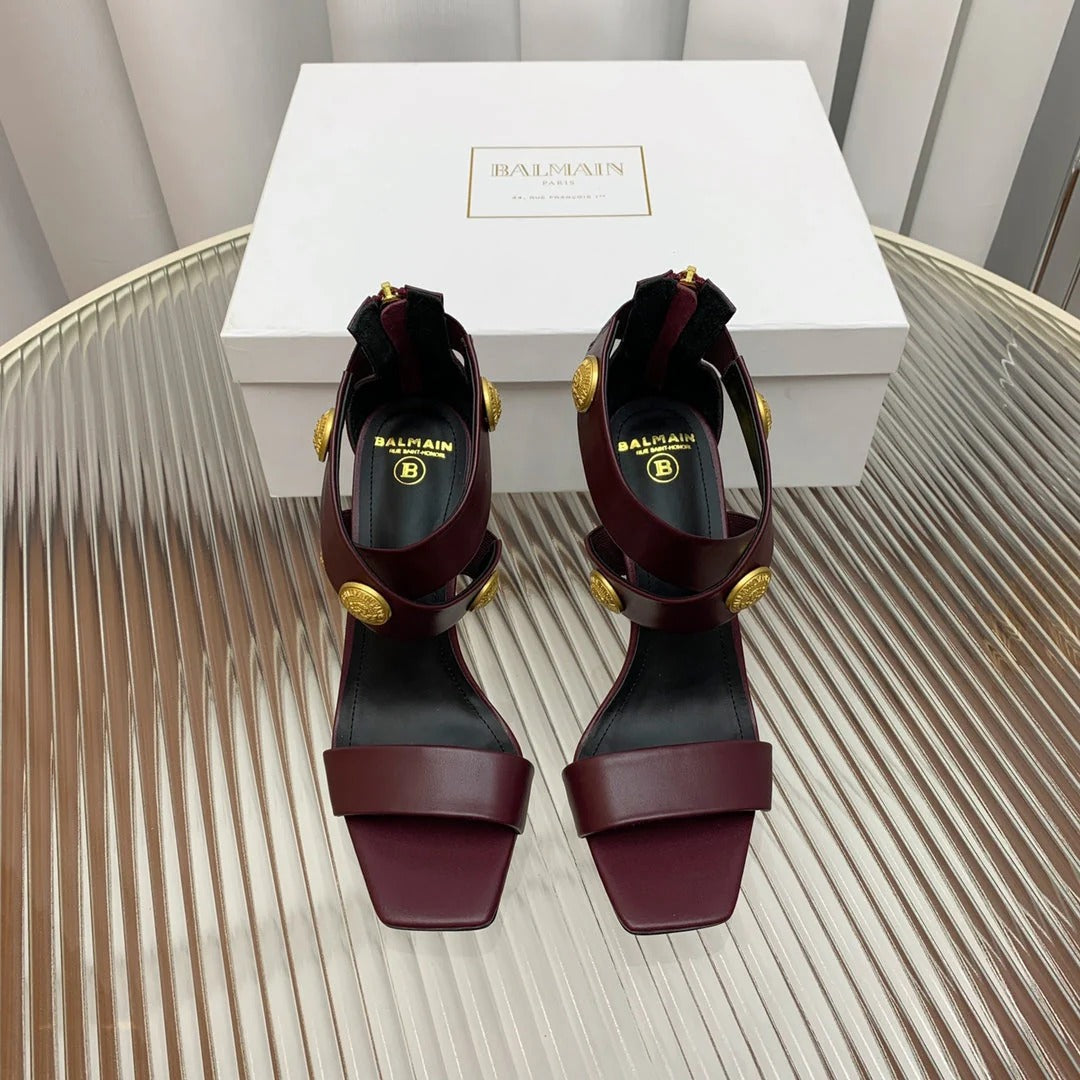 BALMAIN 25S CROSSOVER STRAP HIGH HEELS 95MM IN ROSEWOOD CALFSKIN