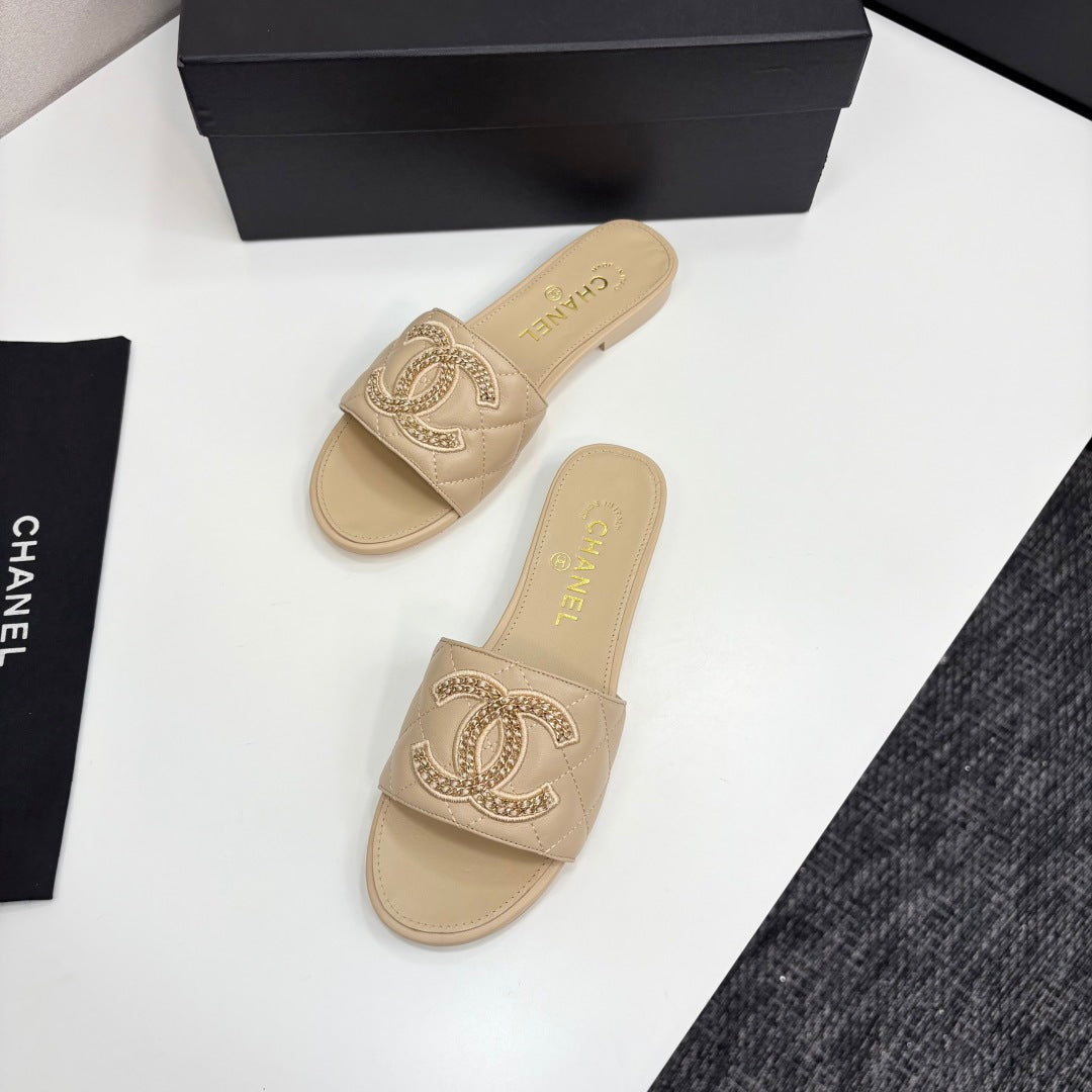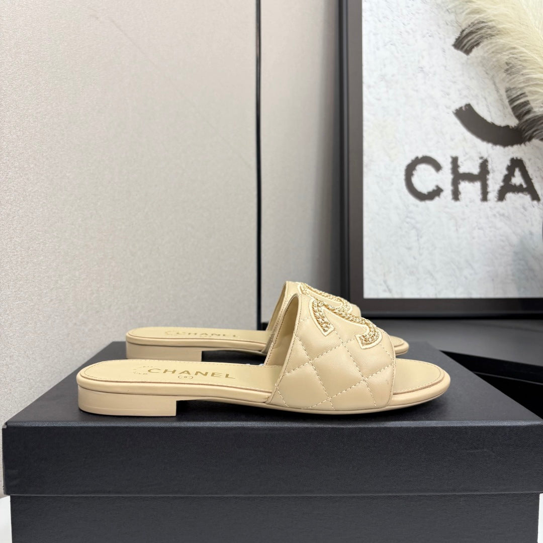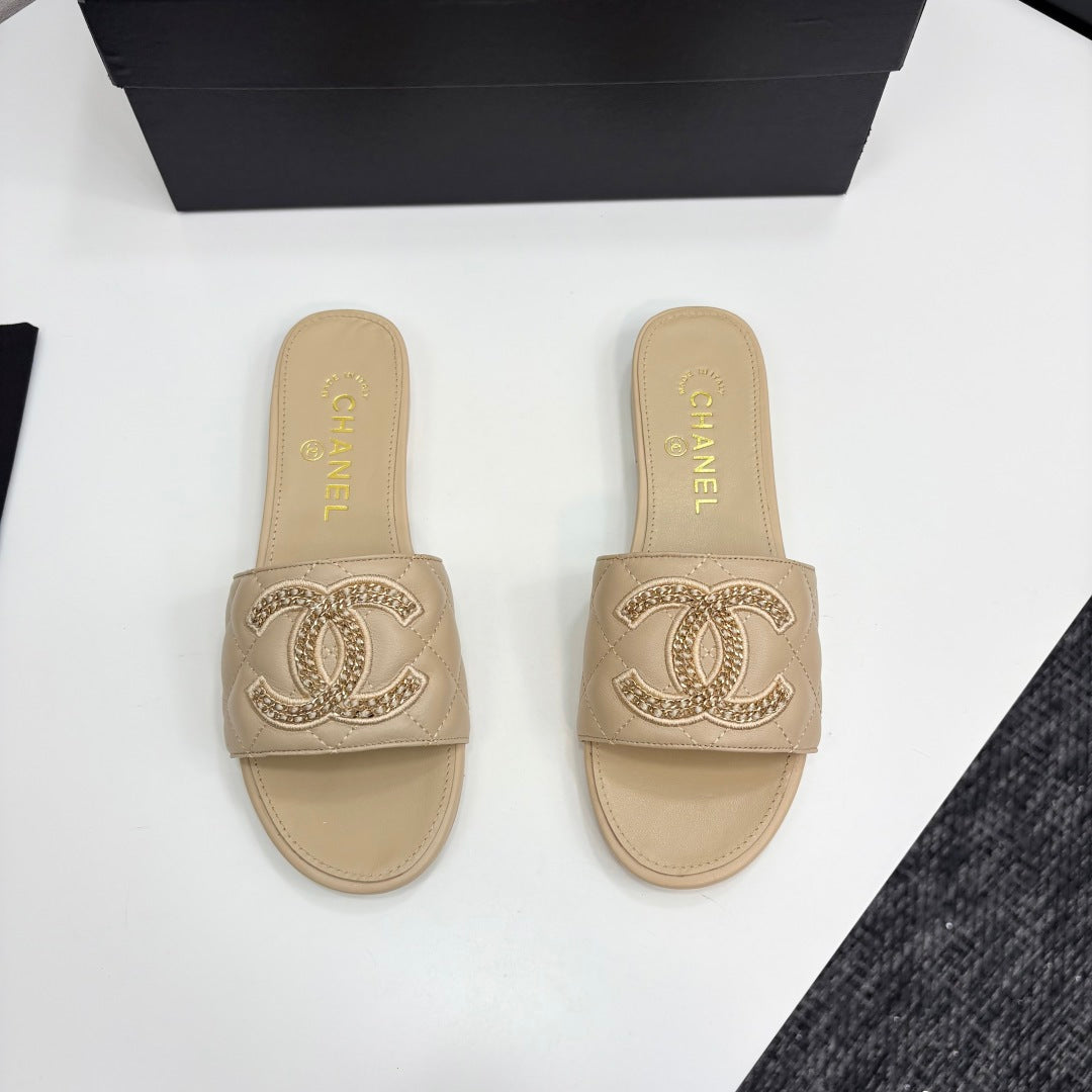 CC 25 Doubble Chain Embroidered Slippers Beige Quilted Sheepskin 352491