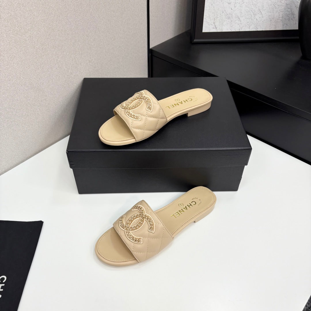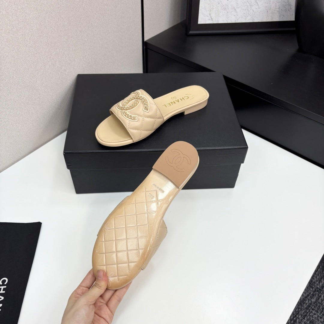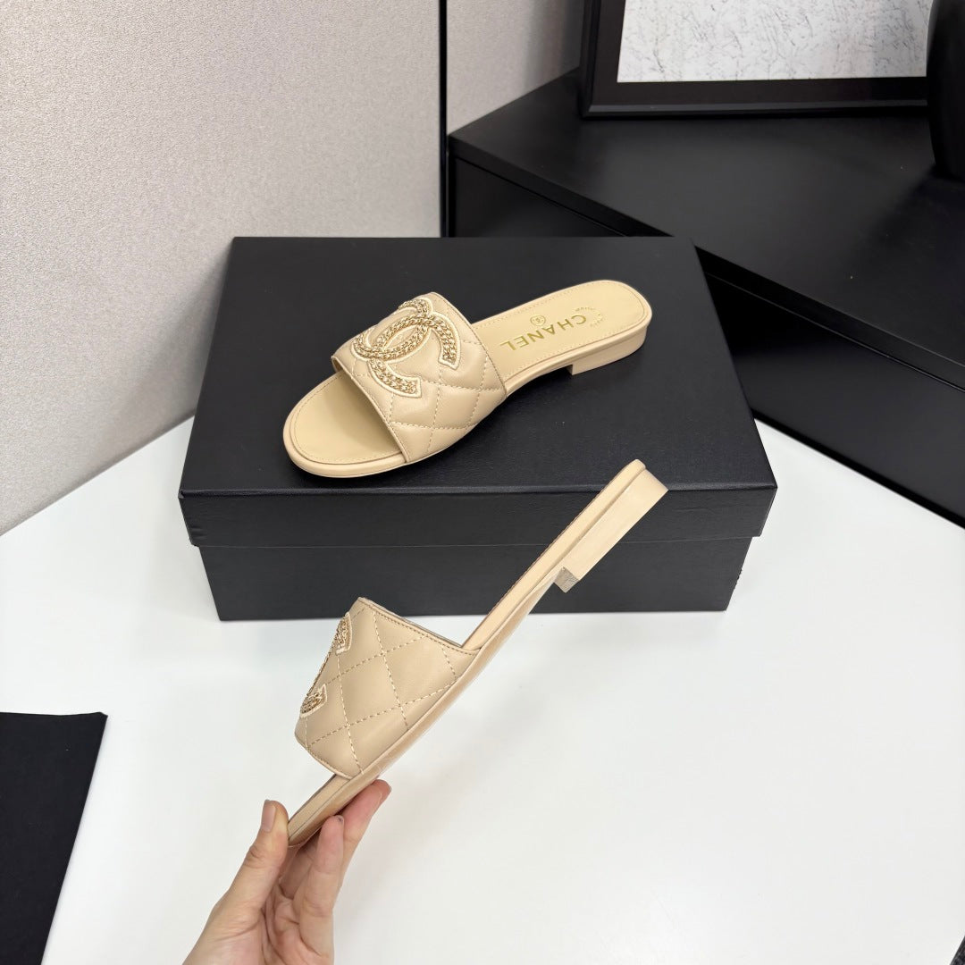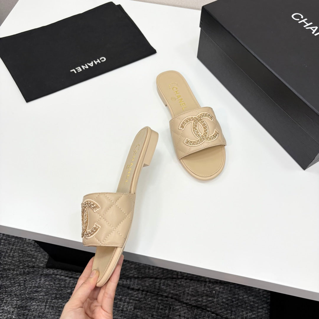 CC 25 Doubble Chain Embroidered Slippers Beige Quilted Sheepskin 352491