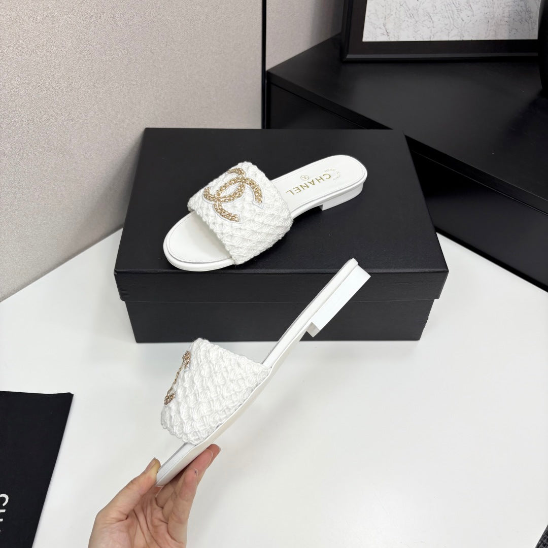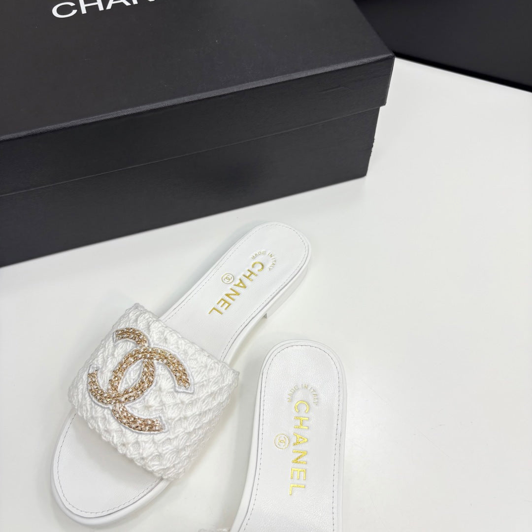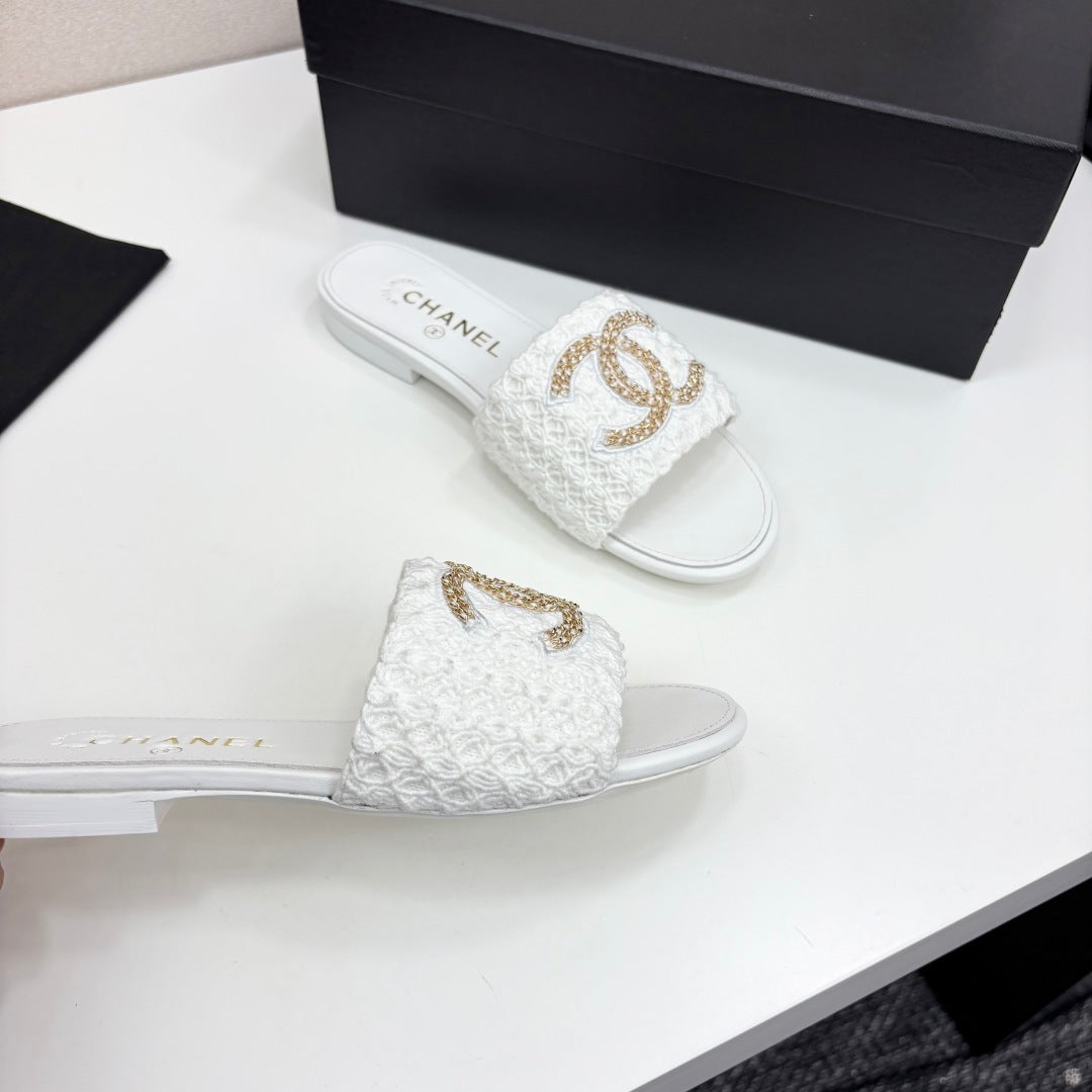 CC 25 Doubble Chain Embroidered Slippers White Fabric And Sheepskin 352492