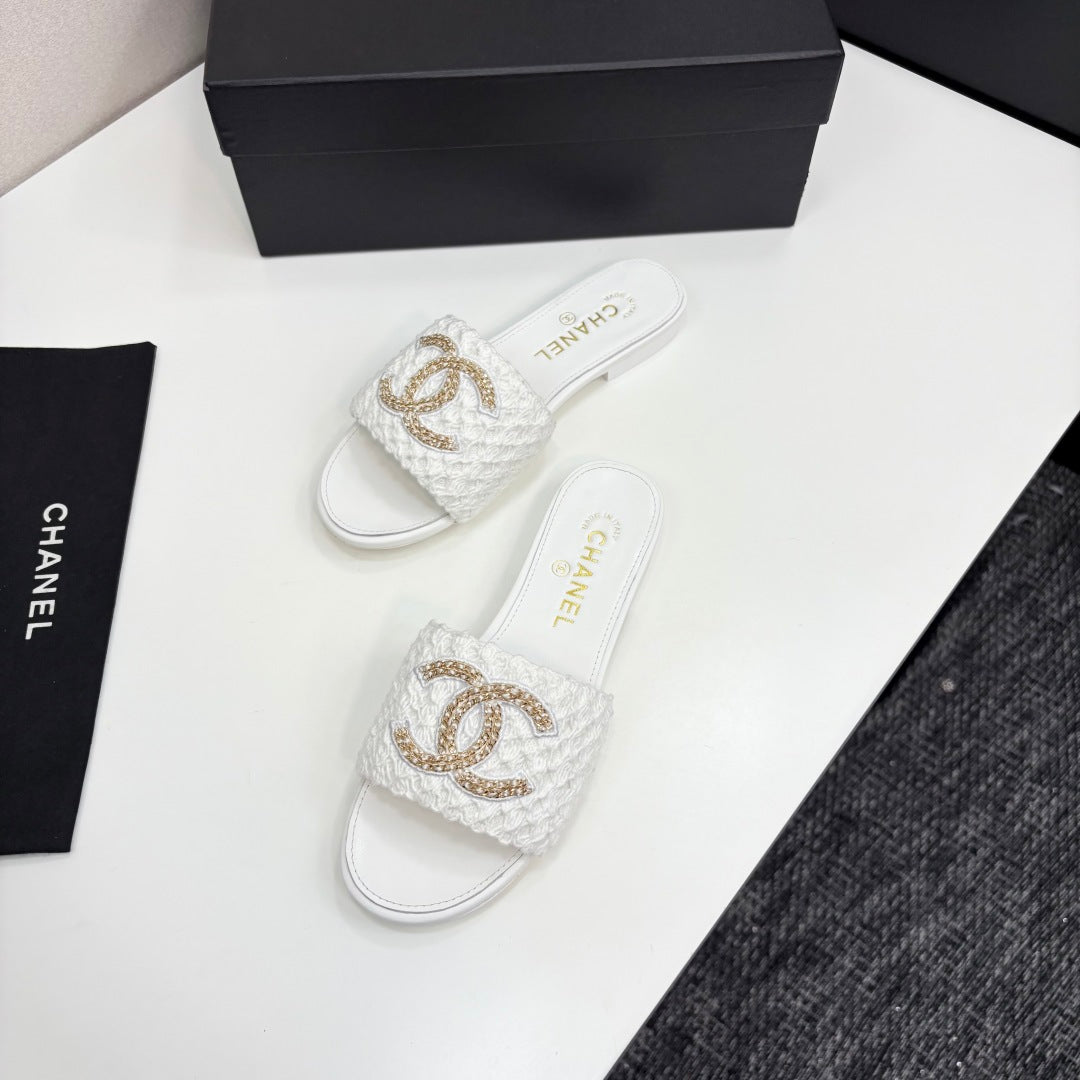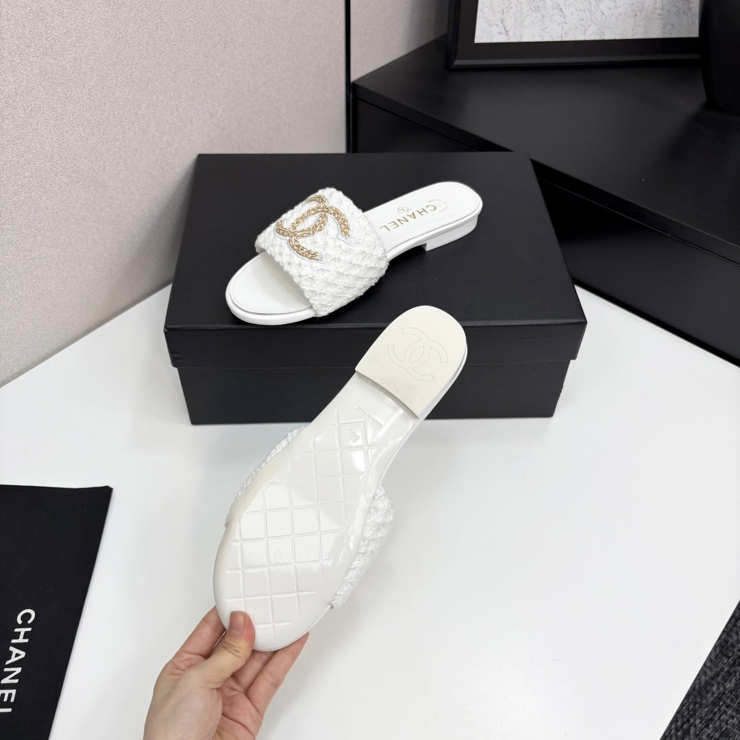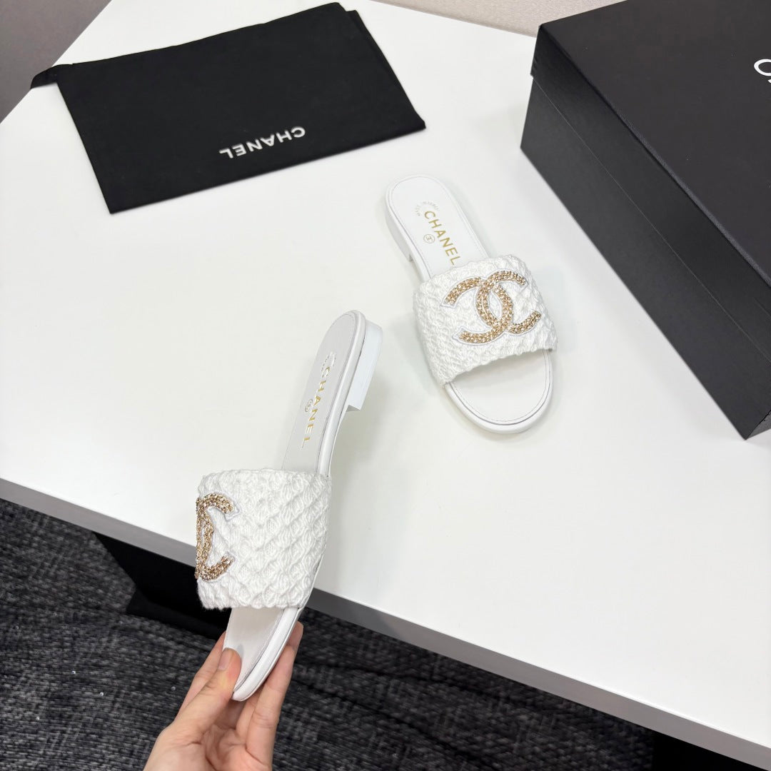 CC 25 Doubble Chain Embroidered Slippers White Fabric And Sheepskin 352492
