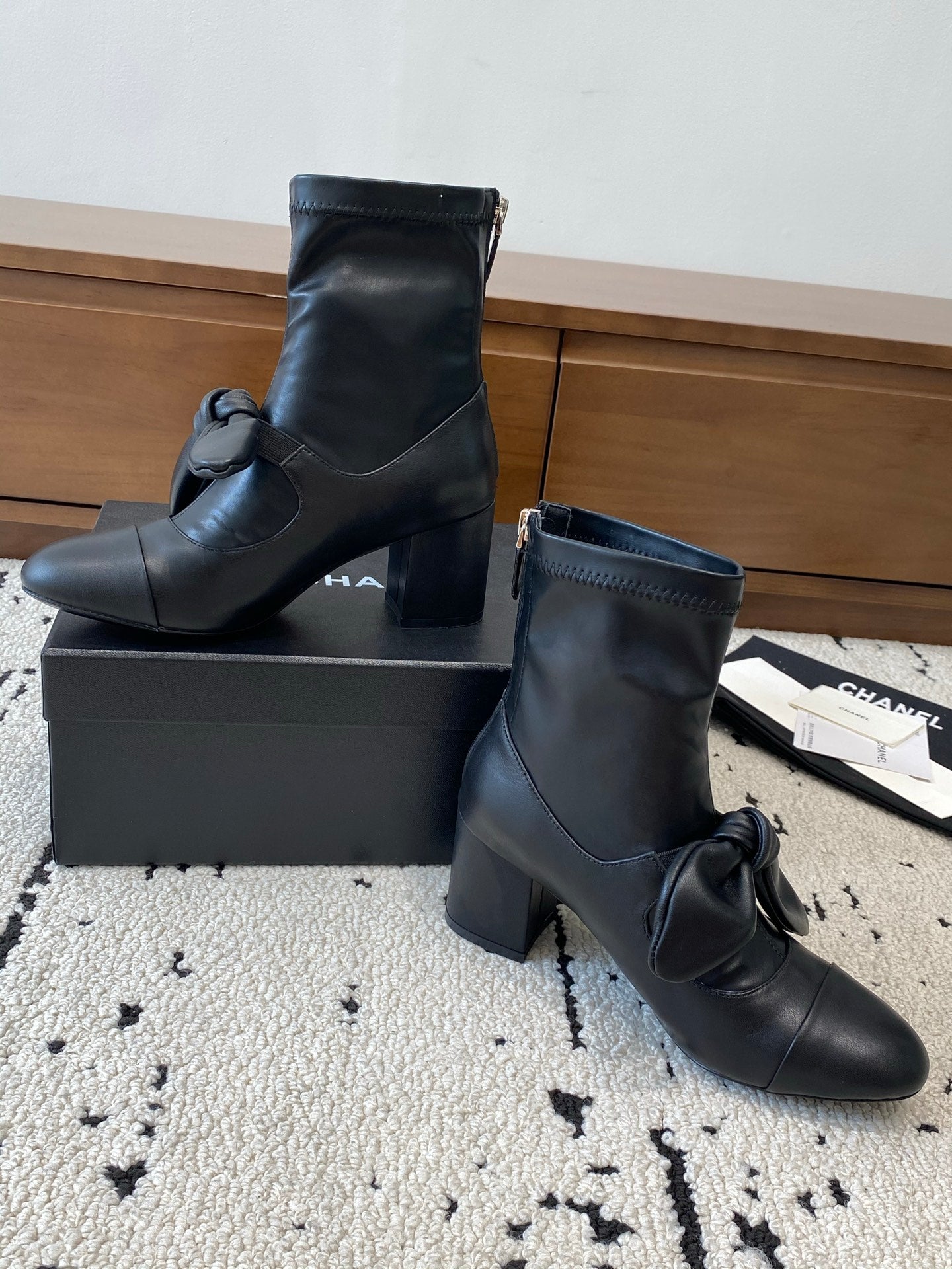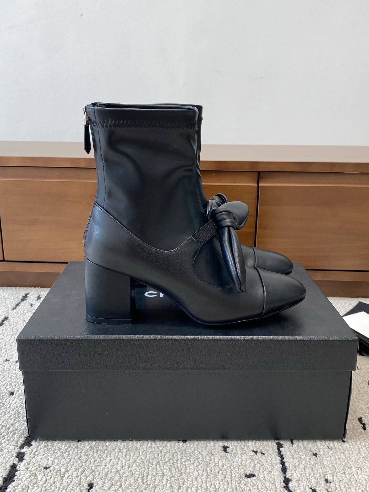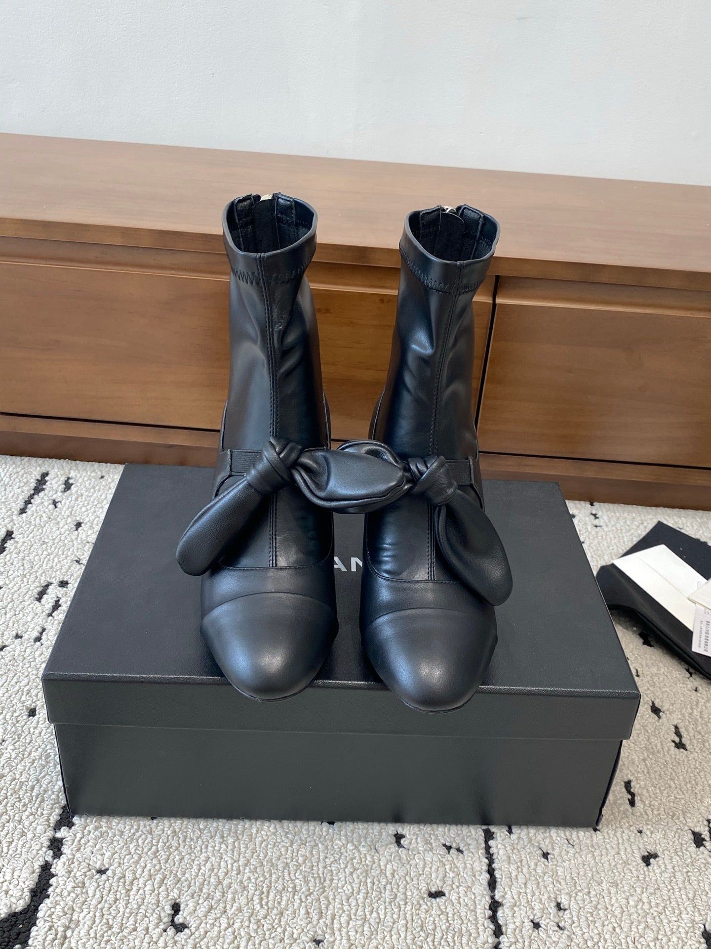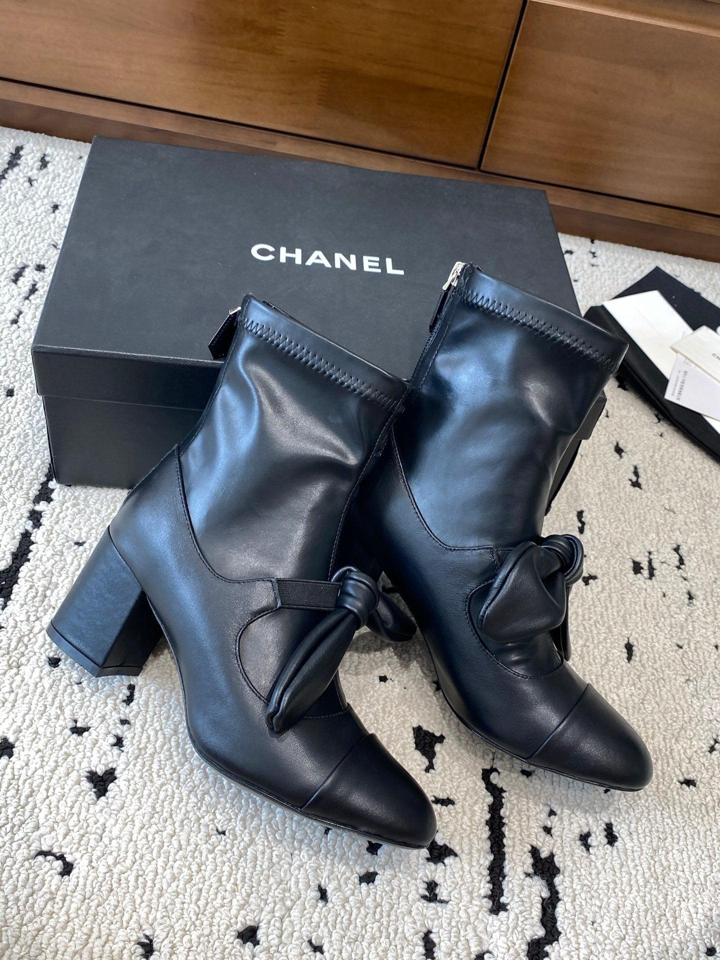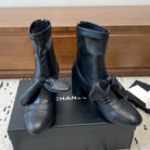 CC Big Ribbon Middle Boots Heel 50mm Black Sheepskin 529280