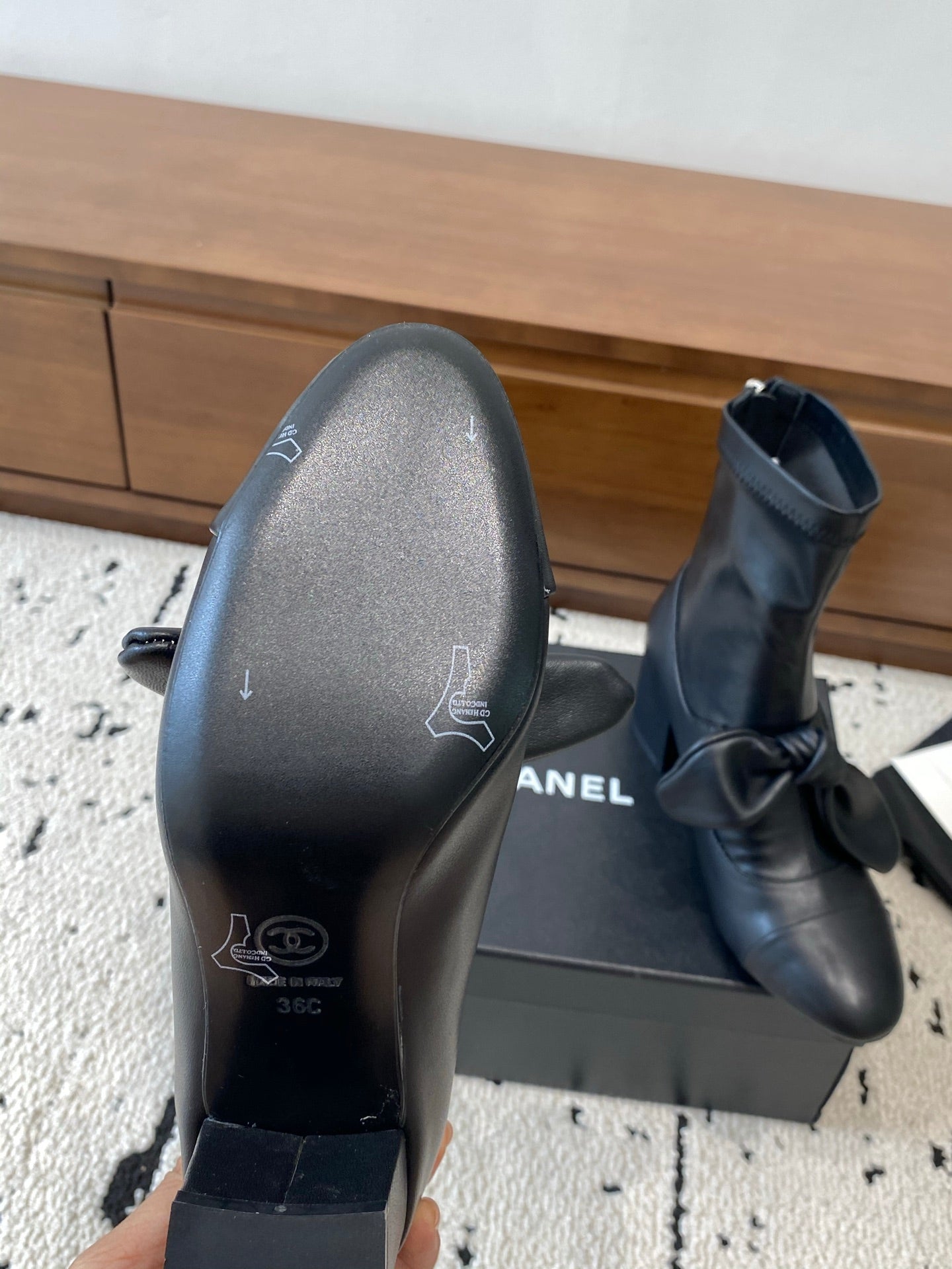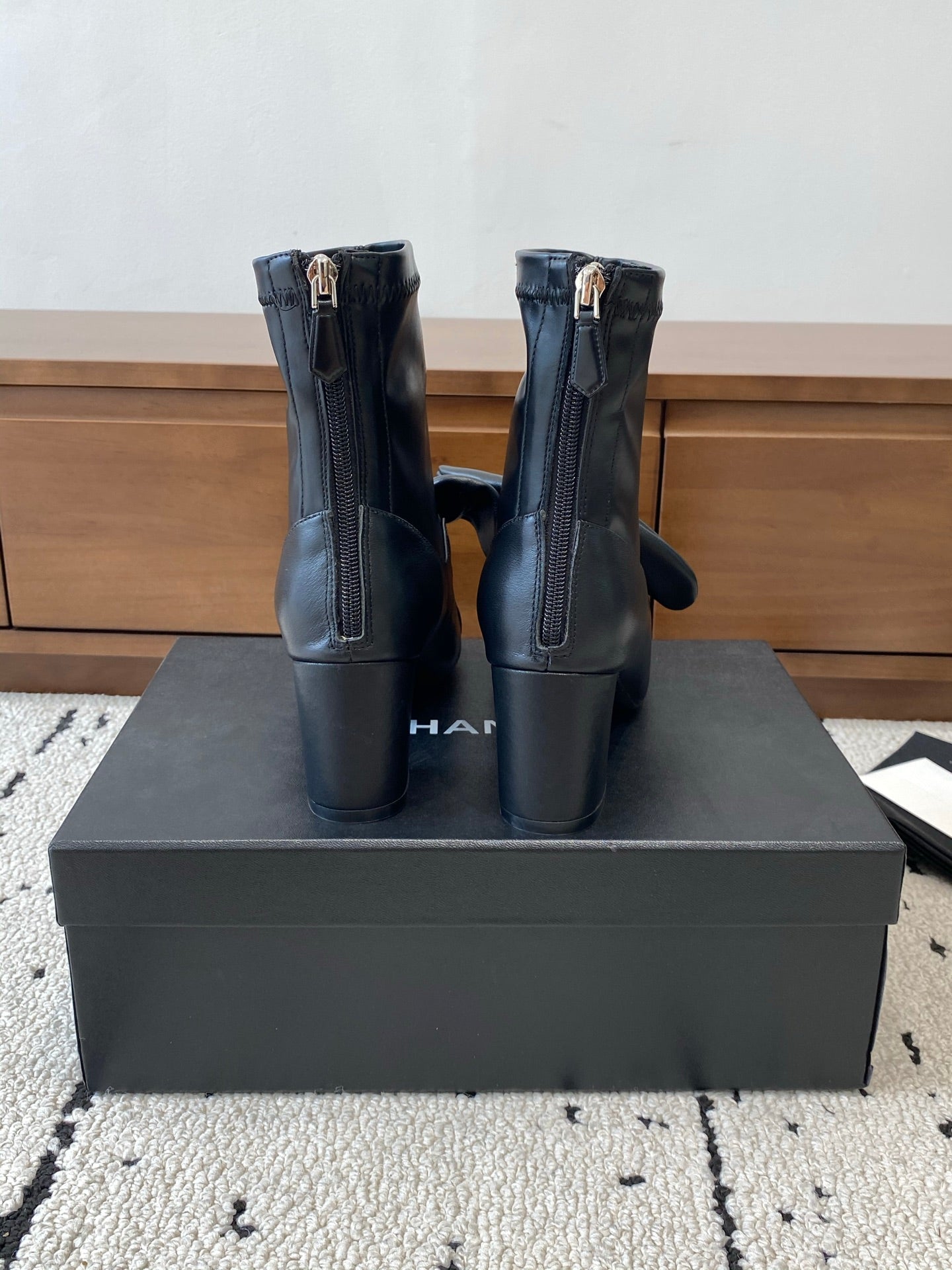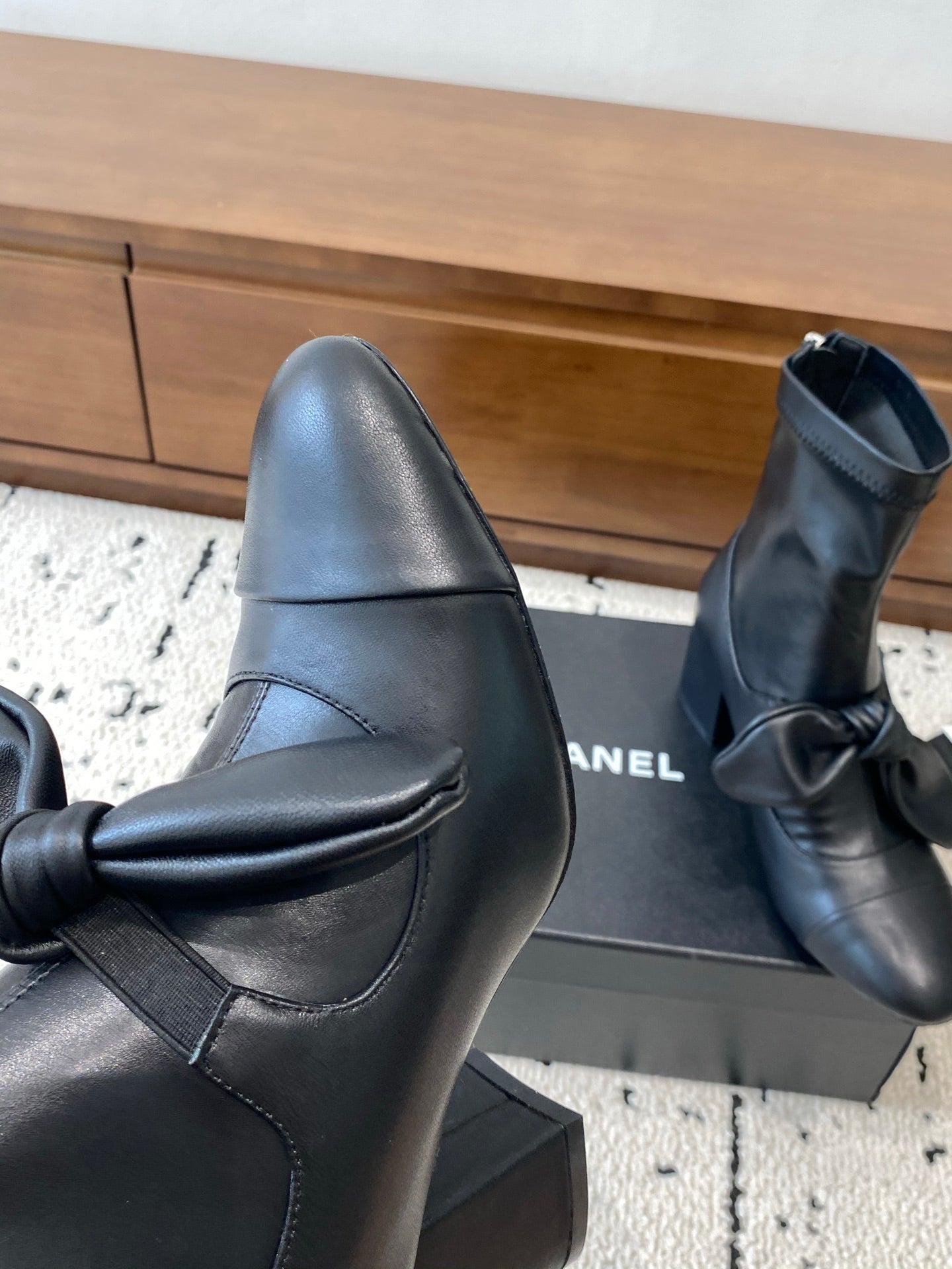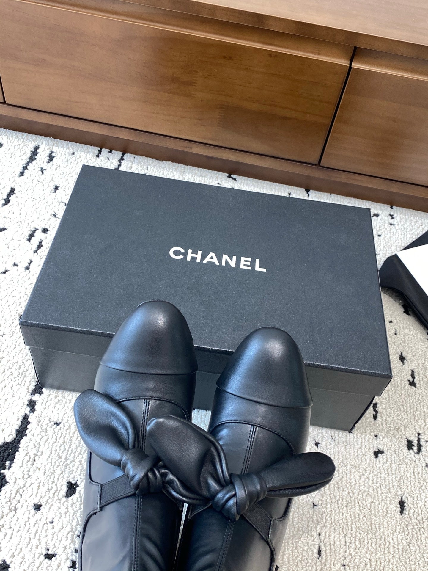 CC Big Ribbon Middle Boots Heel 50mm Black Sheepskin 529280