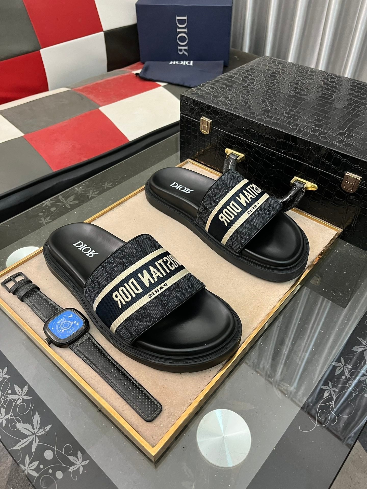 CD SLIDE LETTER SLIPPER BLACK CALFSKIN