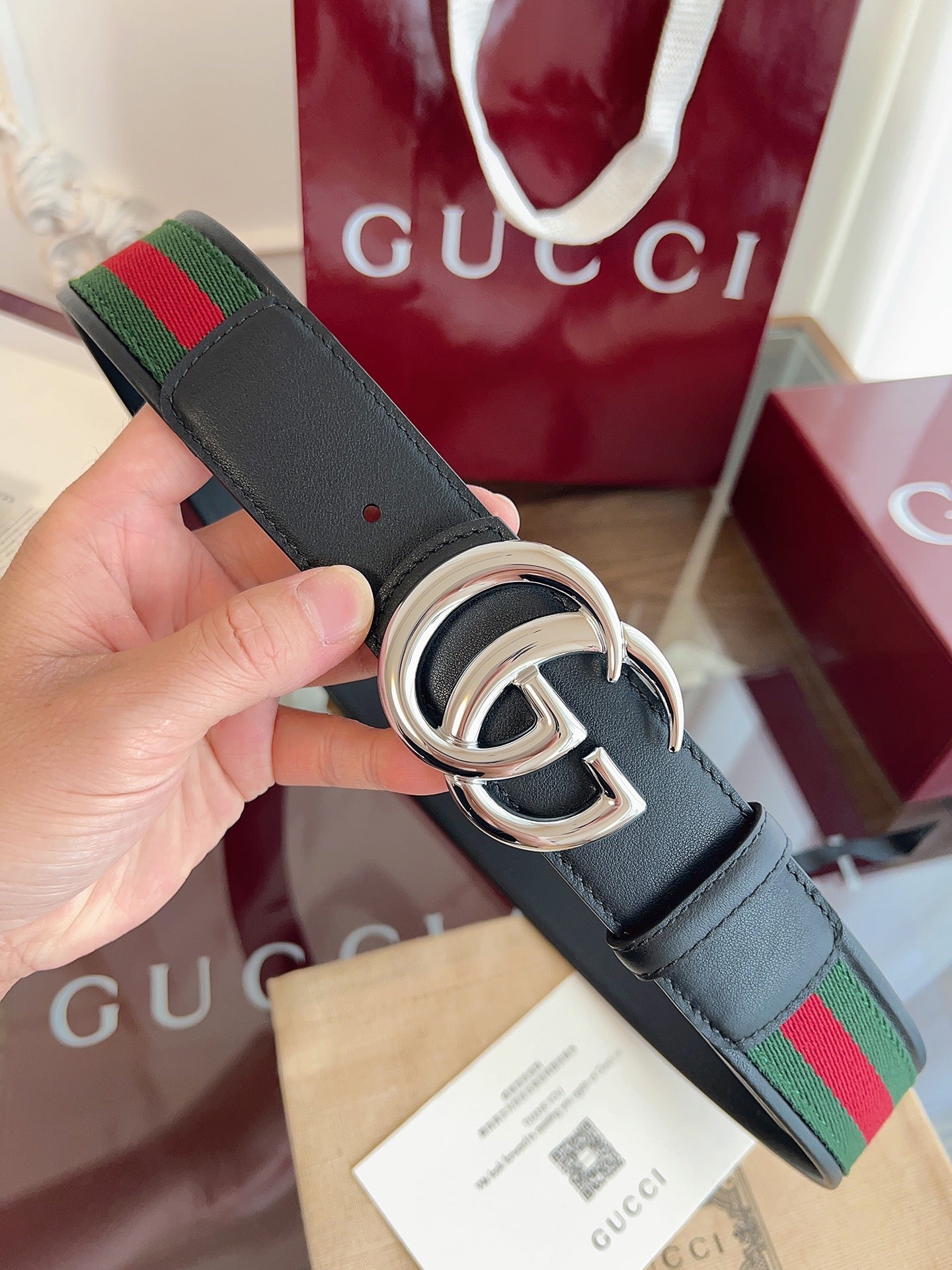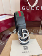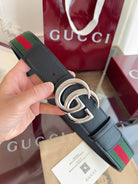 Gucci Belt Double GSliver Buckle 40mm Black Leather With Green Red Canvas