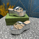 HIGH WEDGE PLATFORM IN SILVER CALFSKIN WITH GOLD HARDWARE